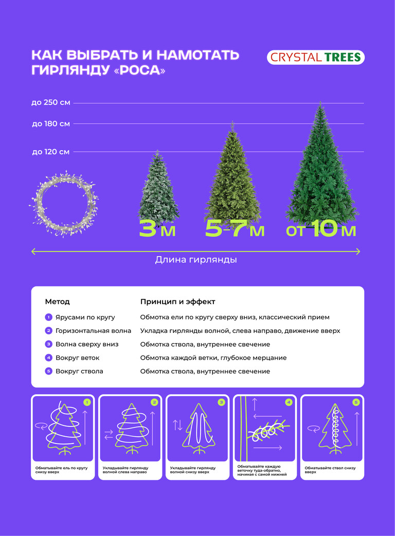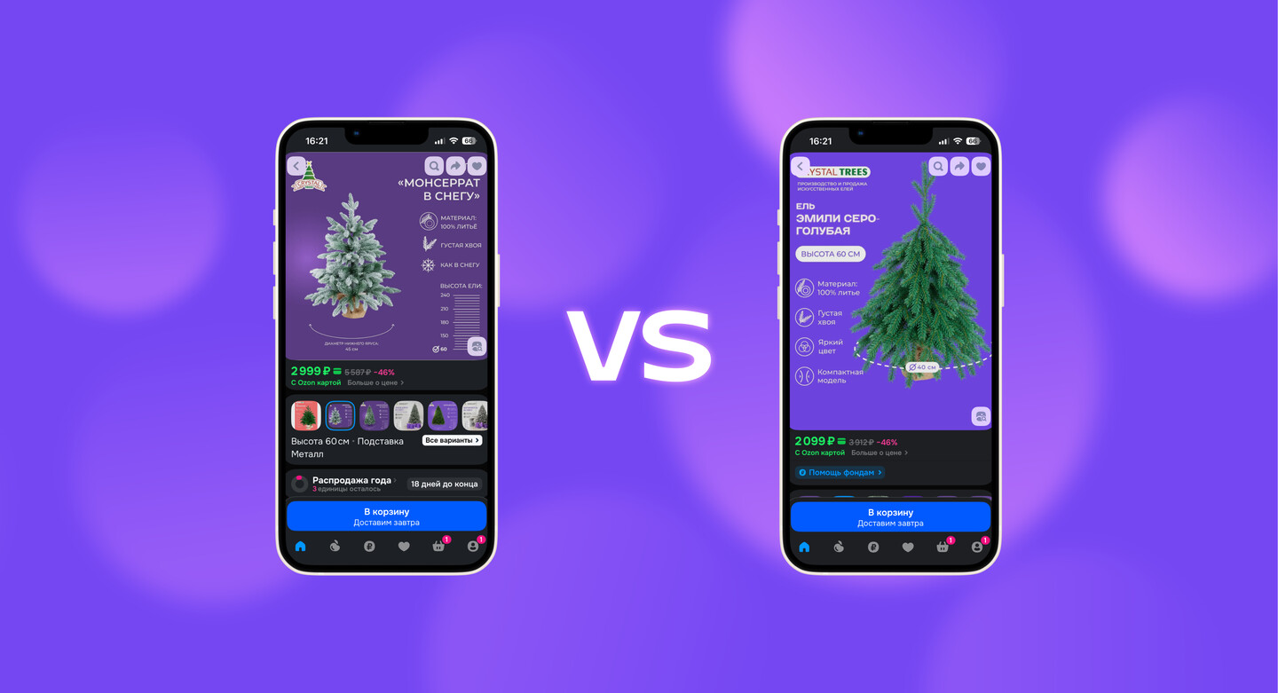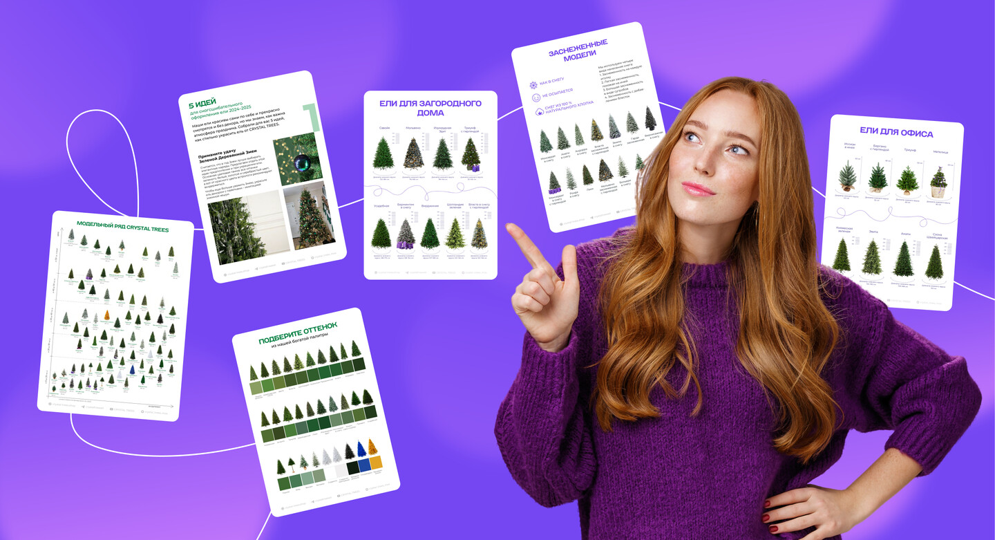 Мы также обновили карточки на маркетплейсах: освежили визуальный язык, адаптировали формат под актуальные требования площадок и создали системные шаблоны, позволяющие легко собирать новые SKU и категории. Помимо этого разработали понятные гайды и схемы — как выбрать и украсить ёлку, чем отличаются модели, что важно при покупке. Такой подход формирует у пользователя привычку к бренду и подчёркивает заботу Crystal Trees о покупателе, что выделяет компанию среди конкурентов.