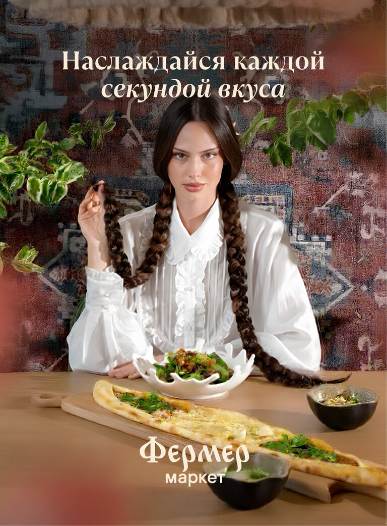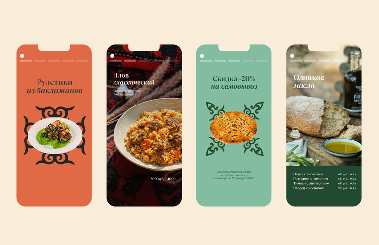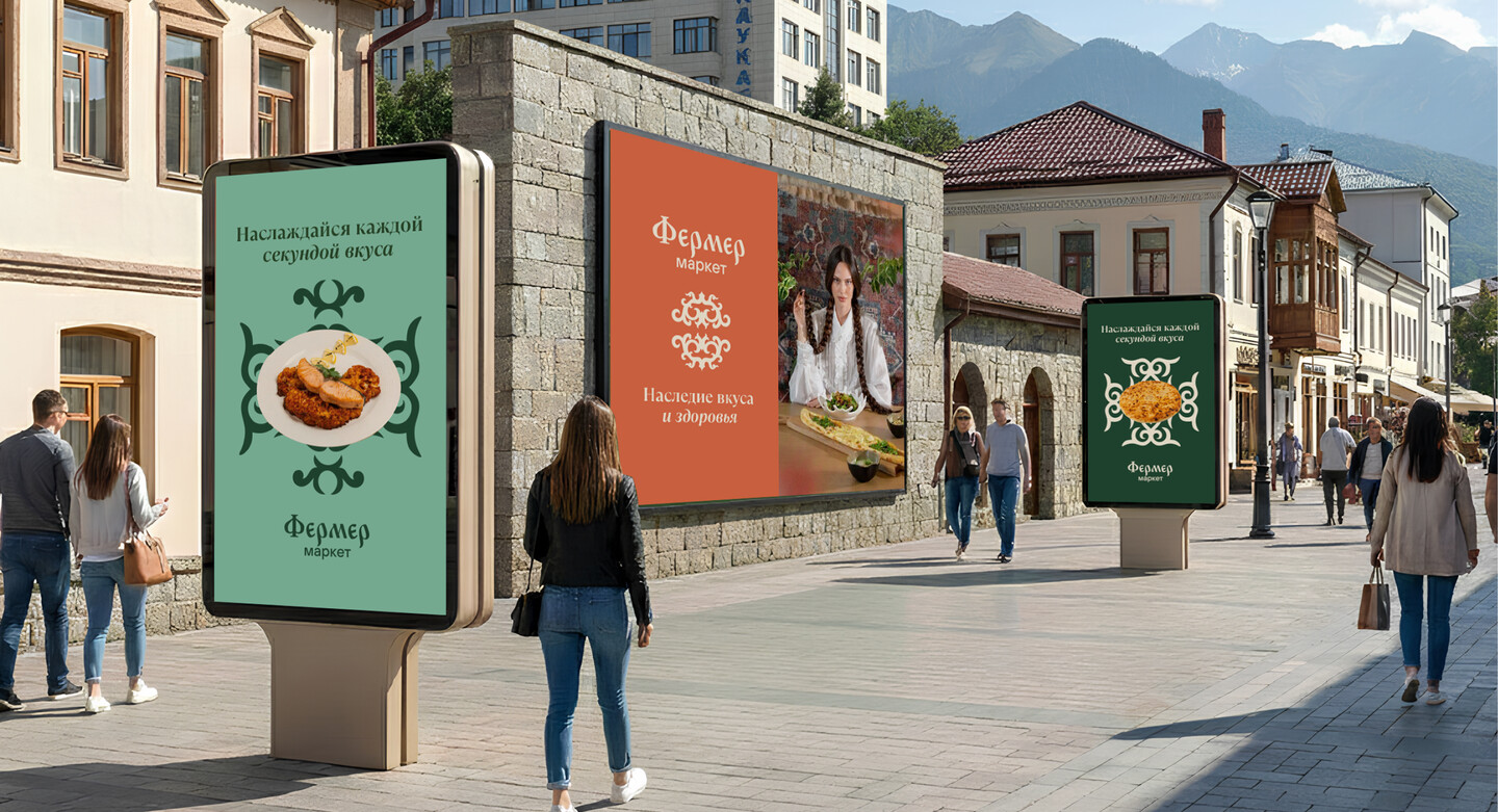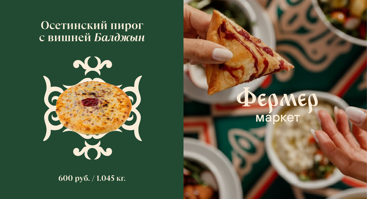 Новая концепция «Фермер Маркет» — современная интерпретация осетинского культурного кода, в котором традиции подаются с премиальной, уверенной сдержанностью. Это чистая графика, аккуратно осмысленные узоры, благородная палитра и визуальная дисциплина, которые создают ощущение качества и профессиональности.