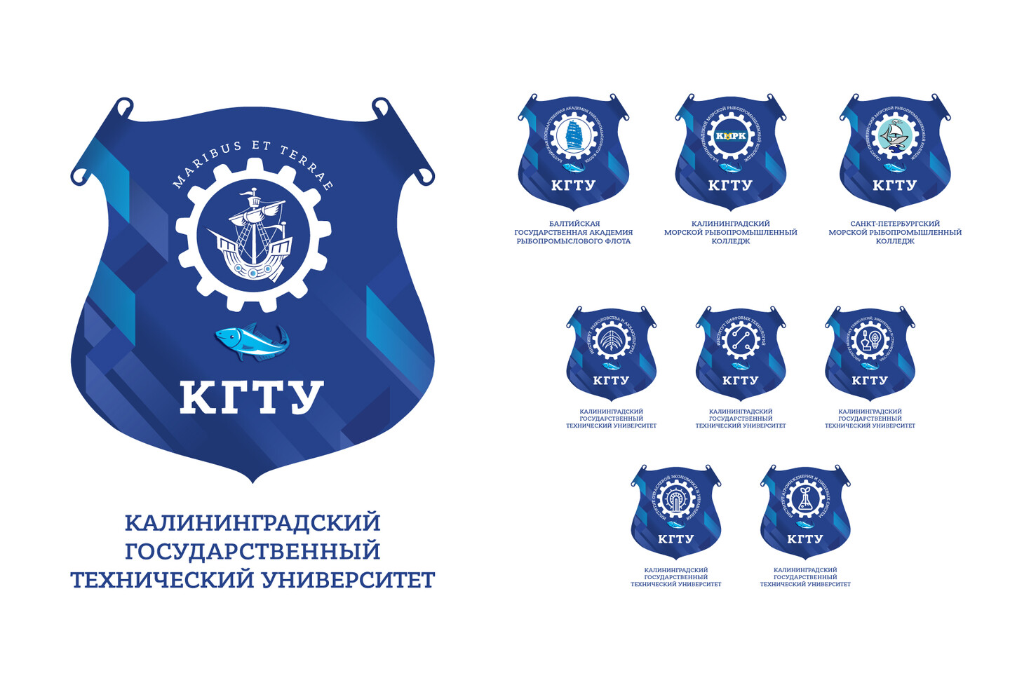 В основе решения — переработанный логотип: современная интерпретация щита с чистой геометрией и цифровыми линиями, упрощённым орнаментом и более читаемой иерархией надписей. Для поддержки нового образа была создана цветовая система с глубоким синим, светло‑голубым, серебристым, белым и серым оттенками, а также графическими «лентами», визуально связанными с движением вперёд, технологичностью и цифровой средой. На этой базе разработана модульная система знаков для всех структурных подразделений: институтов рыболовства и аквакультуры, агроинженерии и пищевых систем, цифровых технологий, морских технологий, энергетики и строительства, инженерной педагогики и гуманитарной подготовки, отраслевой экономики и управления, а также двух морских рыбопромышленных колледжей в Калининграде и Санкт‑Петербурге и Балтийской государственной академии.