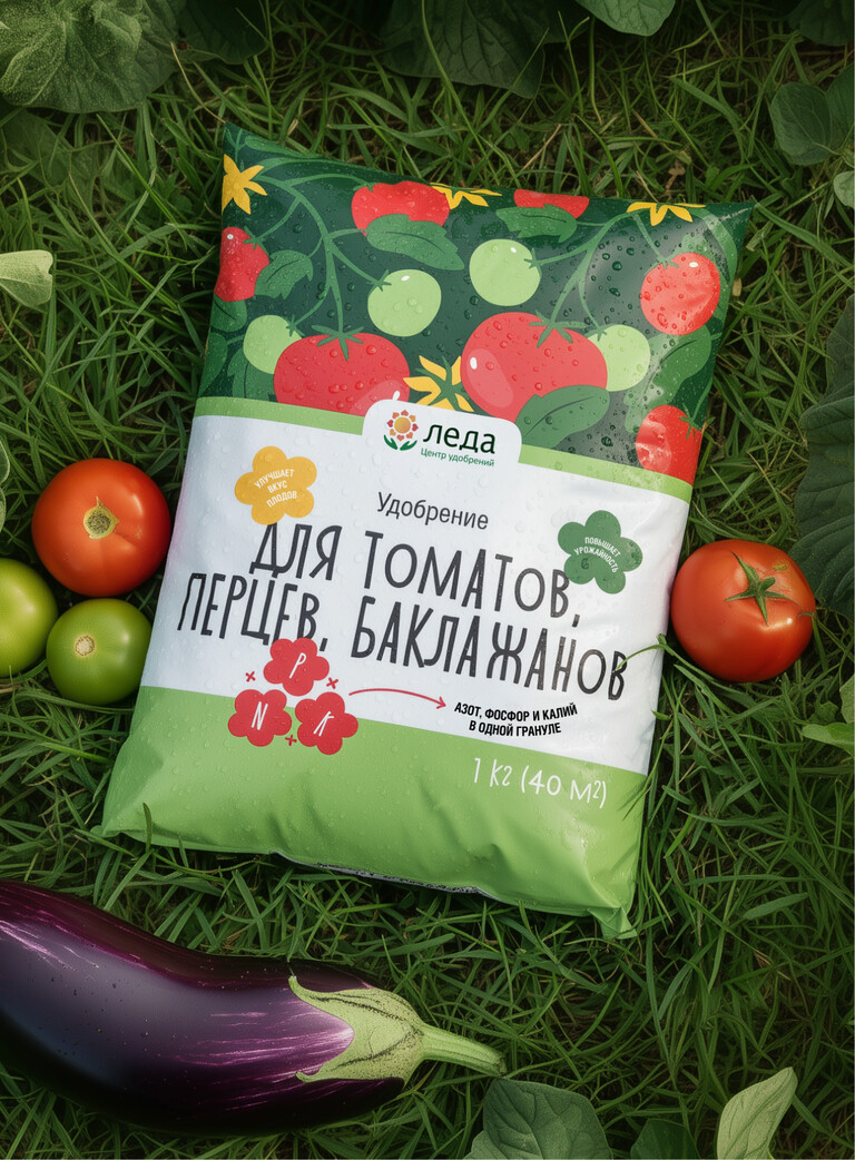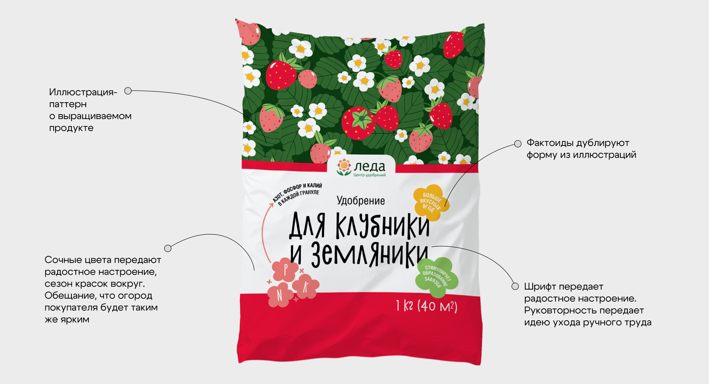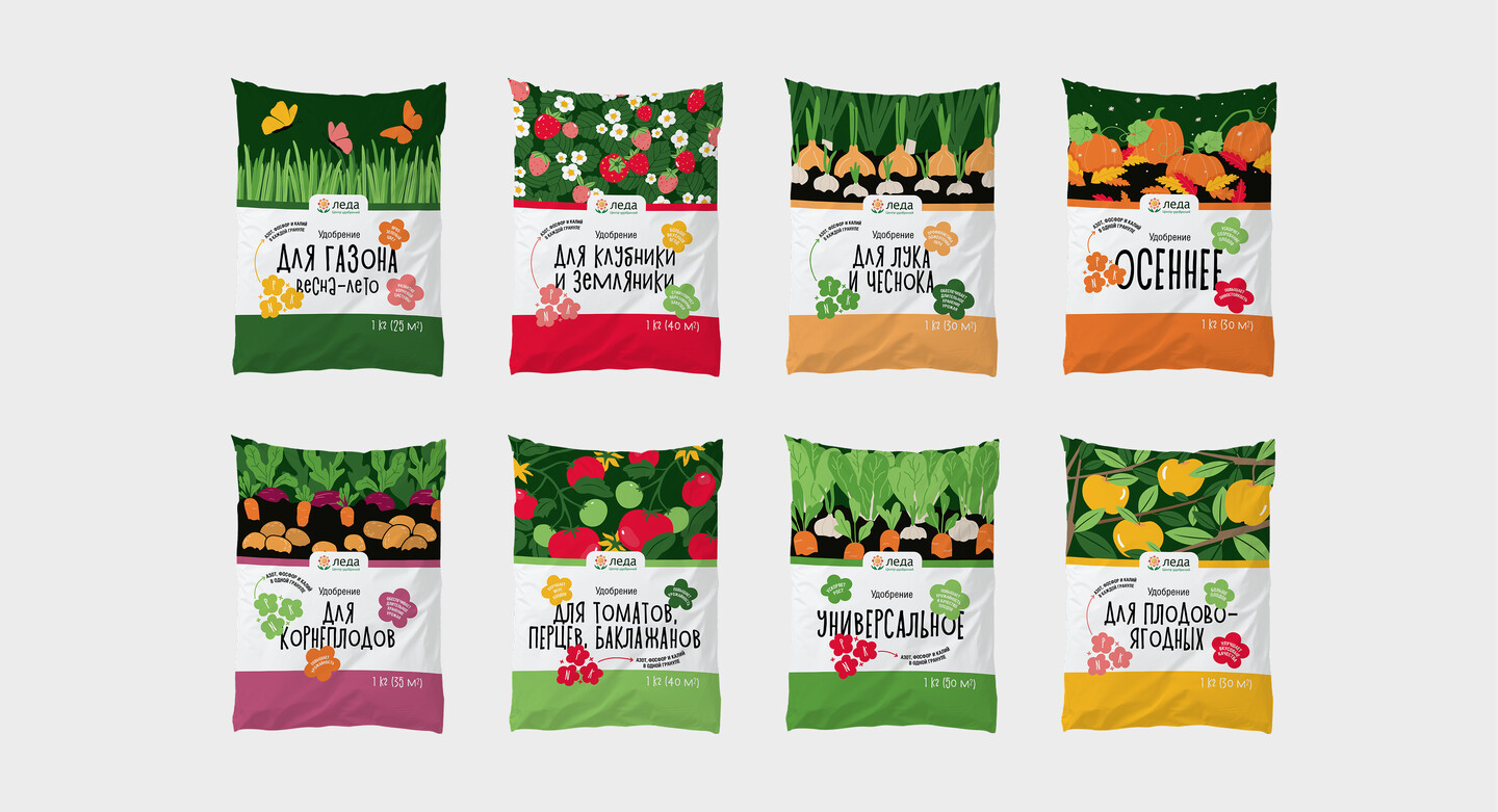 Основная задача проекта заключалась в разработке дизайна упаковки для новой линейки удобрений «Леда», который позволил бы бренду эффективно отстроиться от конкурентов на полке и ясно донести до потребителя ключевые преимущества продукта. Важным требованием было отойти от традиционных ассоциаций с почвой и землей, а вместо этого акцентировать внимание на результате садоводства — его яркости, вкусе и качестве урожая.