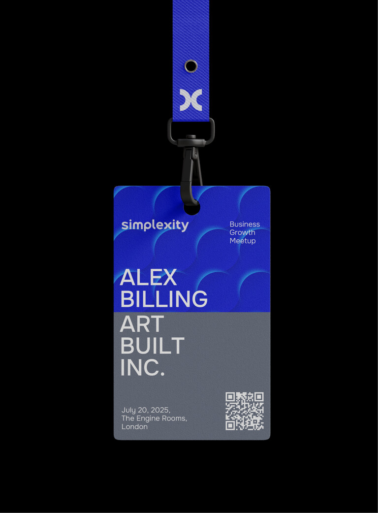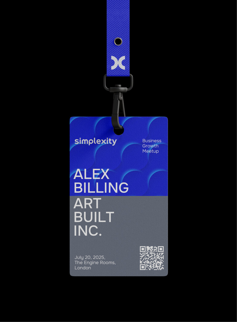 В айдентике эта концепция выражена через чистую типографику, аккуратный логотип и абстрактные визуальные элементы. Логотип шрифтовой, но в нем скрыт знак: буква Х, символ «неизвестного» в уравнении. Simplexity помогает находить ответы и раскрывать все «иксы» индустрии. Плавные округлые формы букв создают ощущение простоты и доверия, а строгая геометрия сохраняет деловой характер.